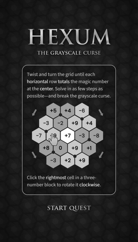 Twist and turn the grid until each horizontal row totals the magic number at the center. Solve in as few steps as possible—and break the grayscale curse.